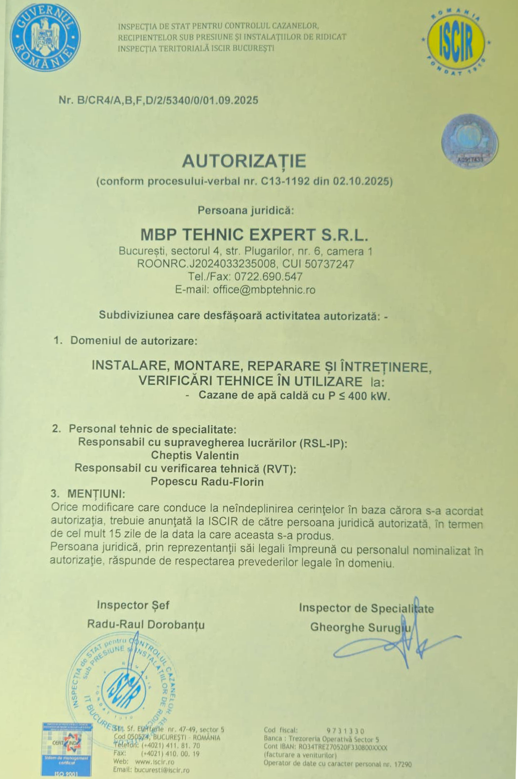 Conform legislației Verificarea Tehnică / Autorizarea ISCIR este obligatorie la fiecare 2 ani.